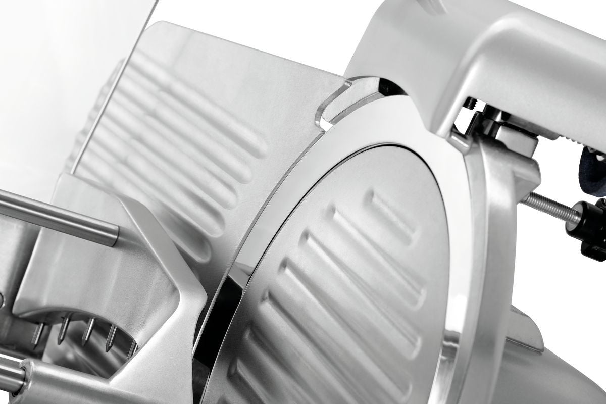 Die Ausstattung der optimierten Aufschnittmaschine mit einem 195er Messer überzeugt durch technische Features in mehrfacher Hinsicht. Der leistungsstarke Schrägschneider verfügt über einen Restehalter, einen Messerschärfer, eine Aufschnittführung und um die Sicherheit zu gewährleisten einen zweifachen Messerschutz sowie einen Magnetschalter.