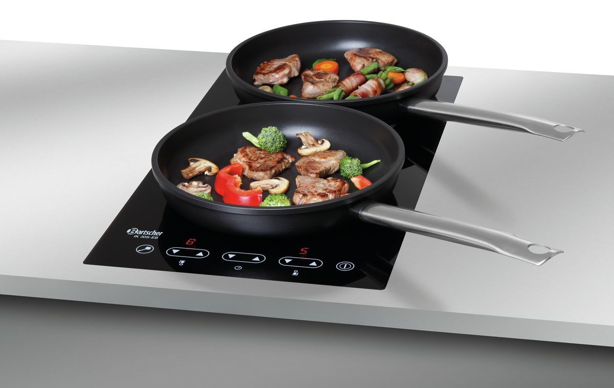 Einbaufähiges, platzsparendes Induktionskochfeld mit hintereinander liegenden Kochstellen und einer durchgehenden Schott-Ceran-Oberfläche.